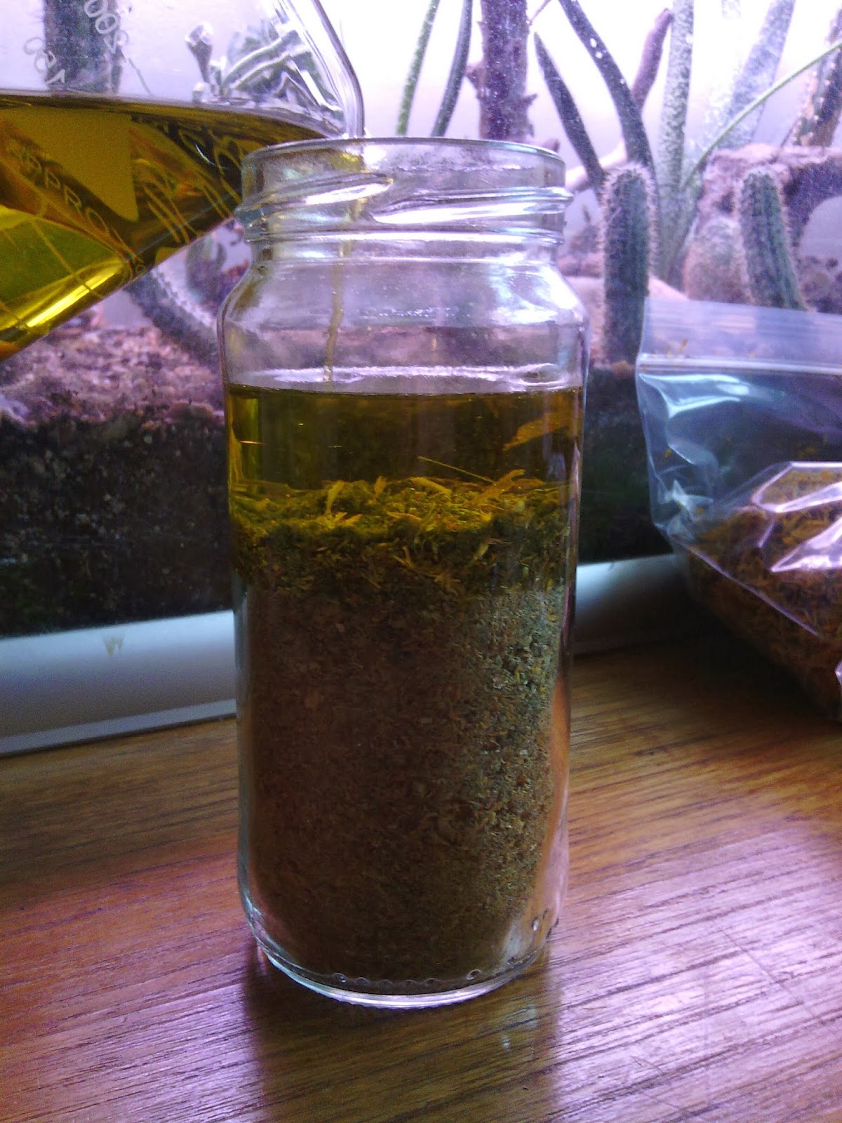 sekä mittaa ja Lisää tarvittava määrä öljyä yrtin sekaan ja sulje purkki. lopuksi voit vielä tiirailla parisen tuntia josko öljyä tarvitsisi lisätä. öljyn pinnan pitäisi olla noin 1-2cm kylläisen yrttiaineksen yläpuolella. Merkitse käyttämäsi öljyn määrä ylös. huomiota tulee kiinnittää myös valitsemasi uuttopurkin kokoon, Yrttiaines paisuu öljyä lisätessä ja tuotoksella tulisi olla myös tilaa liikkua purkissa sitä ravisteltaessa uuttamis aikana.